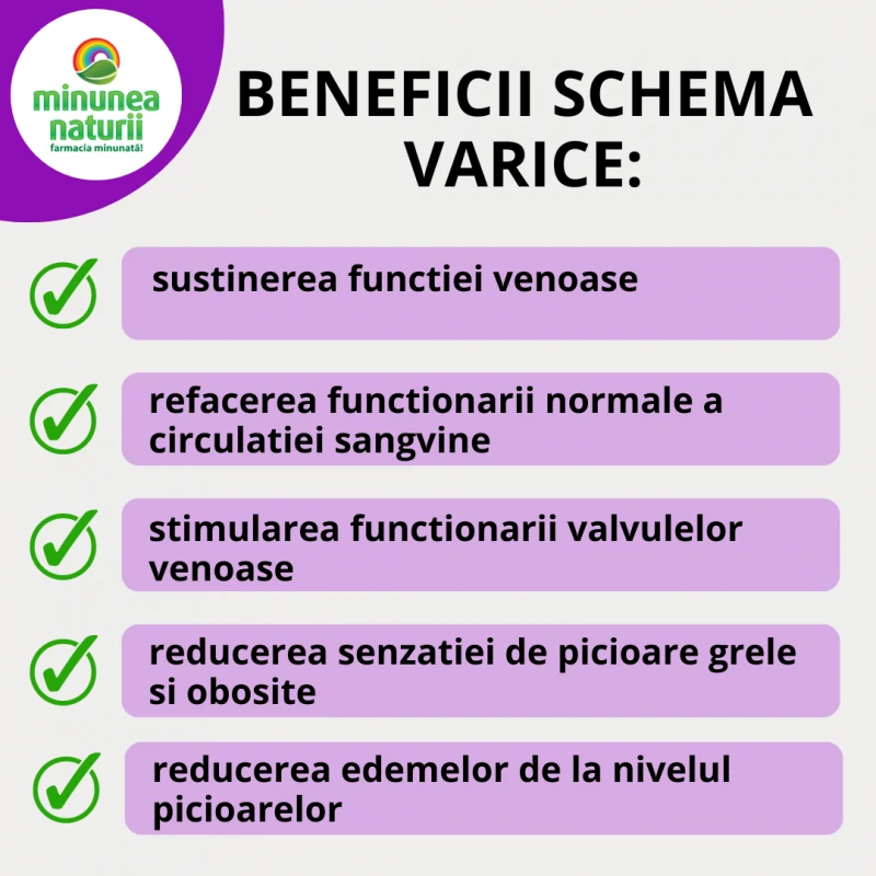 Schema de suplimente tratament natural VARICE | minuneanaturii.ro Schema de tratament pentru varice, vene varicoase, artrite, arterite, felbite si tromboflebite. Schema pentru varice este o combinatie optima de remedii pentru: sustinerea functiei venoase refacerea functionarii normale a circulatiei sangvine stimularea functionarii valvulelor venoase reducerea senzatiei de picioare grele si obosite reducerea edemelor de la nivelul picioarelor fortifierea vaselor de sange Pentru mai multe detalii despre varice si probleme venoase va invitam sa cititi articolul special pe aceasta tema: Scapa de varice prin metode naturale Mod de administrare Schema de tratament natural VARICE : Retolise - 3x2 capsule/zi Polygemma 6 - Varice Hemoroizi 50ml Plantextrakt - 2 ml de 2 ori pe zi, diluati in putina apa, inainte de mese Resveratrol cu Seleniu - 2x1 capsula pe zi, cu 30 de minute inainte de masa Vitamina C esterificata 1000mg - Naturmil - 3x1cps/zi la masa Stimuven plus gel varice 60g - Aliphia Exhelios - se aplica gelul pe zonele afectate de 2 ori pe zi si se maseaza usor de jos in sus, respectiv dinspre glezna inspre coapse. Schema de tratament natural VARICE este conceputa si recomandata de Farm. Anca si Adrian Ienin. Schema de suplimente tratament natural VARICE Alege acum Schema de tratament natural VARICE si bucura-te de beneficii!